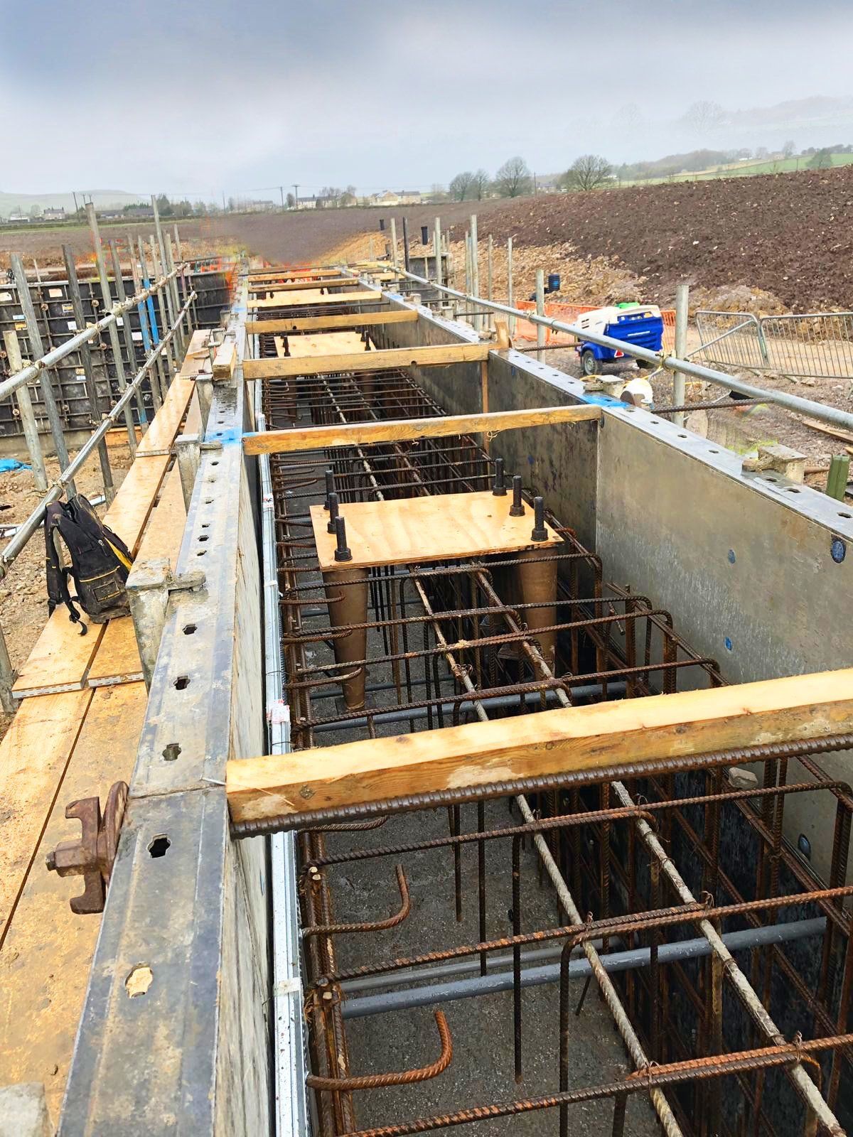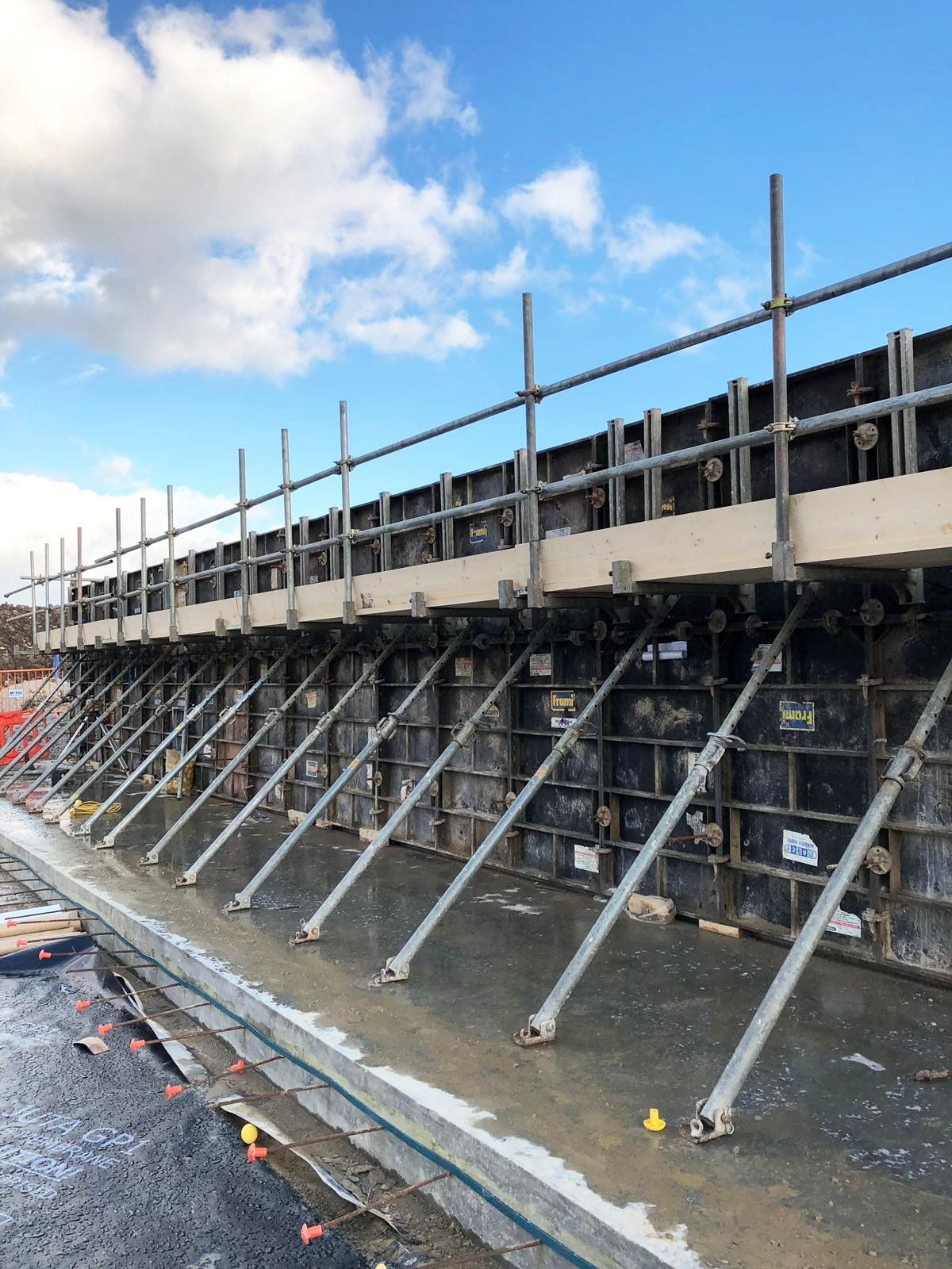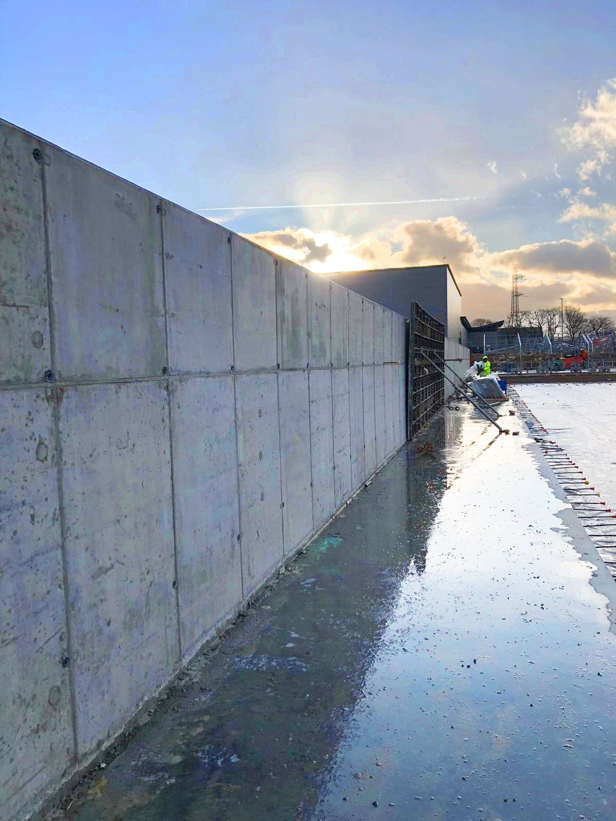 The bulk earthworks and drainage works are nearing completion. The structural concrete works to provide dock leveller areas have commenced including the construction of a 100-metre-long by 2.5-metre-high reinforced concrete wall and slab power floated to FM3 finish serving as a retaining wall for the new extension.